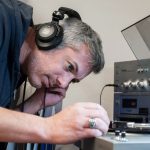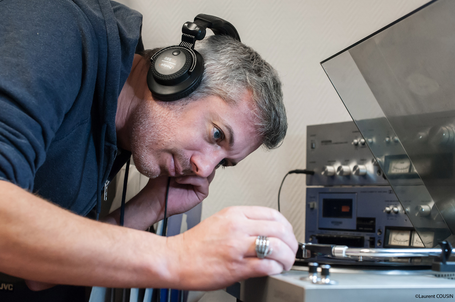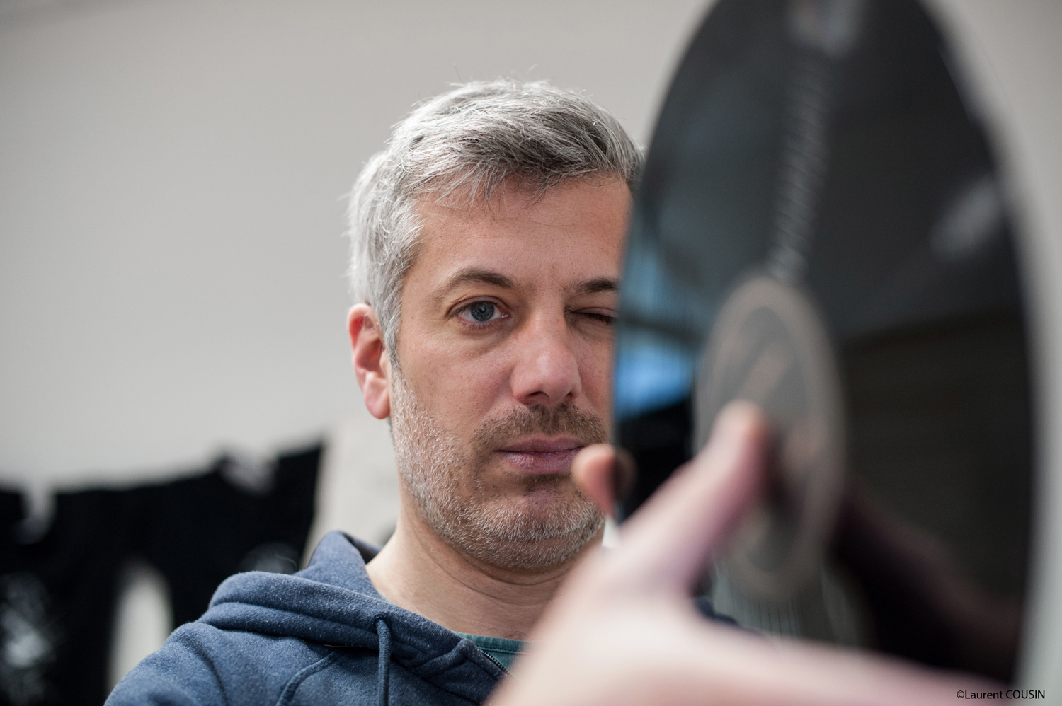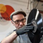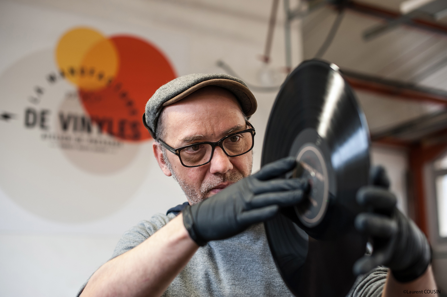 Lionel Daviet effectue un contrôle visuel d’un disque vinyle.