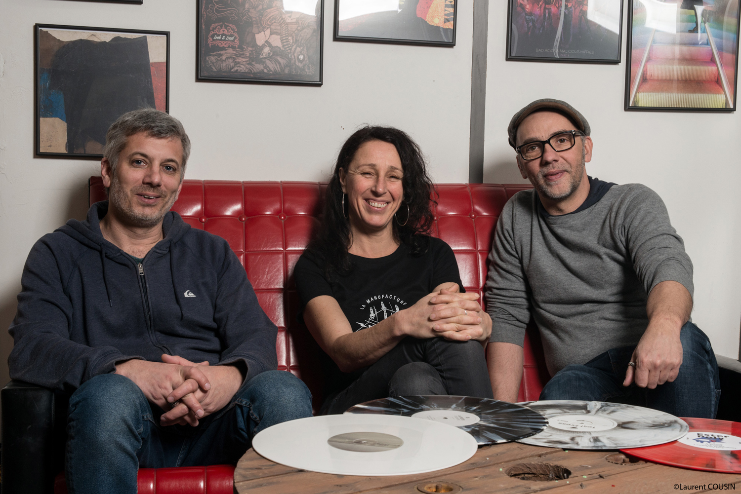Lionel Daviet, Emmanuelle Margueron et Philippe Margueron les 3 associé-es a l’origine de la « manufacture du vinyles » à Lathuile sur les bords du lac d’Annecy.
