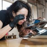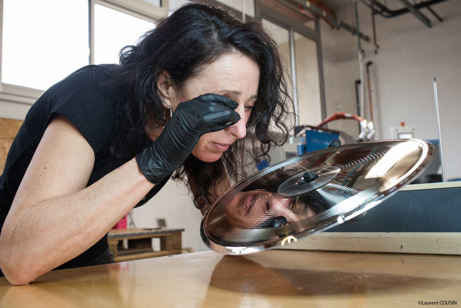 Emmanuelle Margueron, contrôle à la loupe le « stamper » ou encore la matrice sur laquelle est gravée en négatif la musique. Le Stamper doit être parfaitement propre pour assurer une bonne qualité audio du disque après pressage.