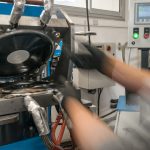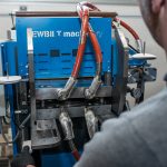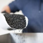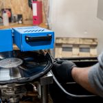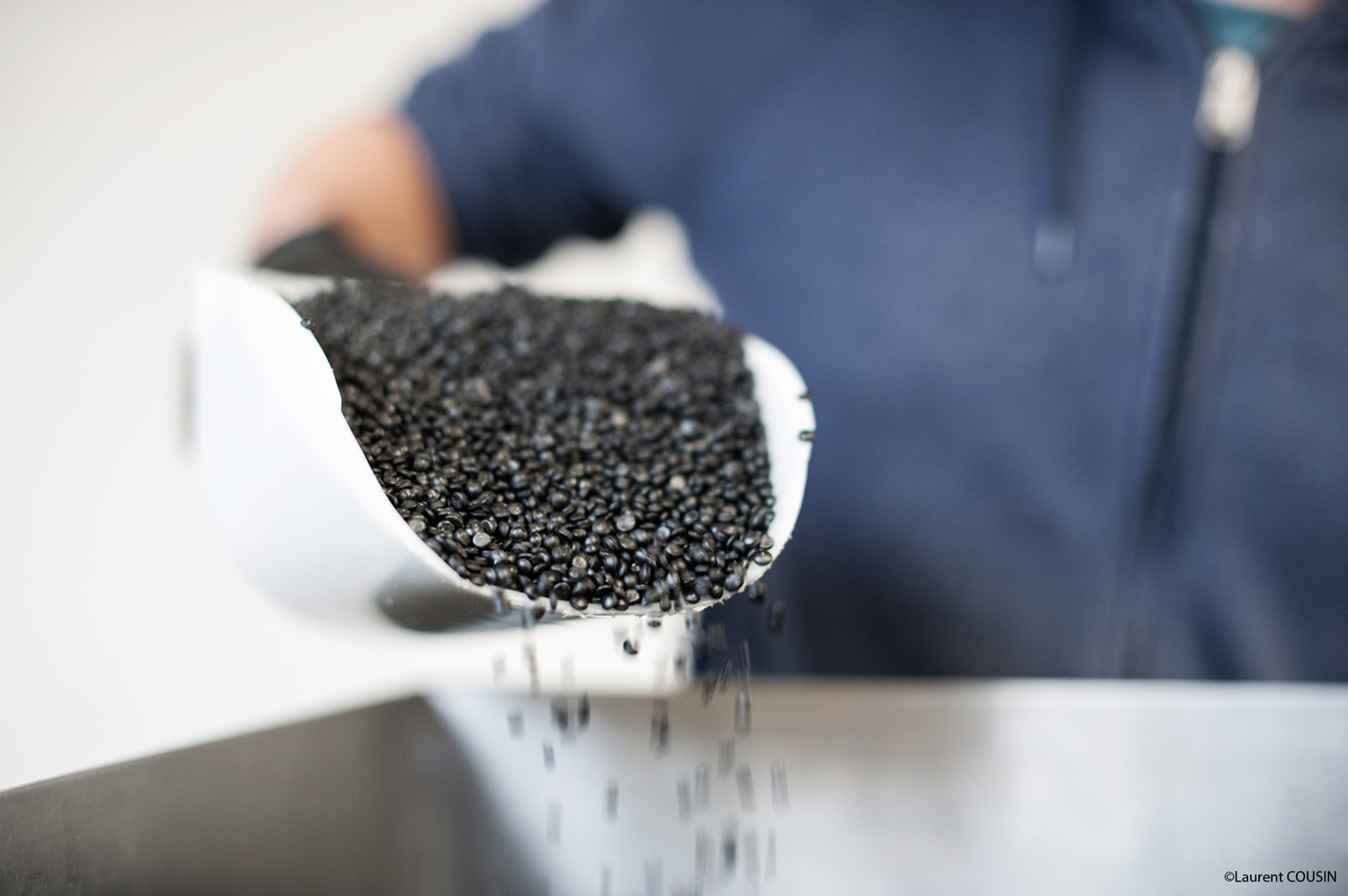 Lionel Daviet alimente la machine en granules de vinyle qui après chauffage sortiront sous forme de « cake ».