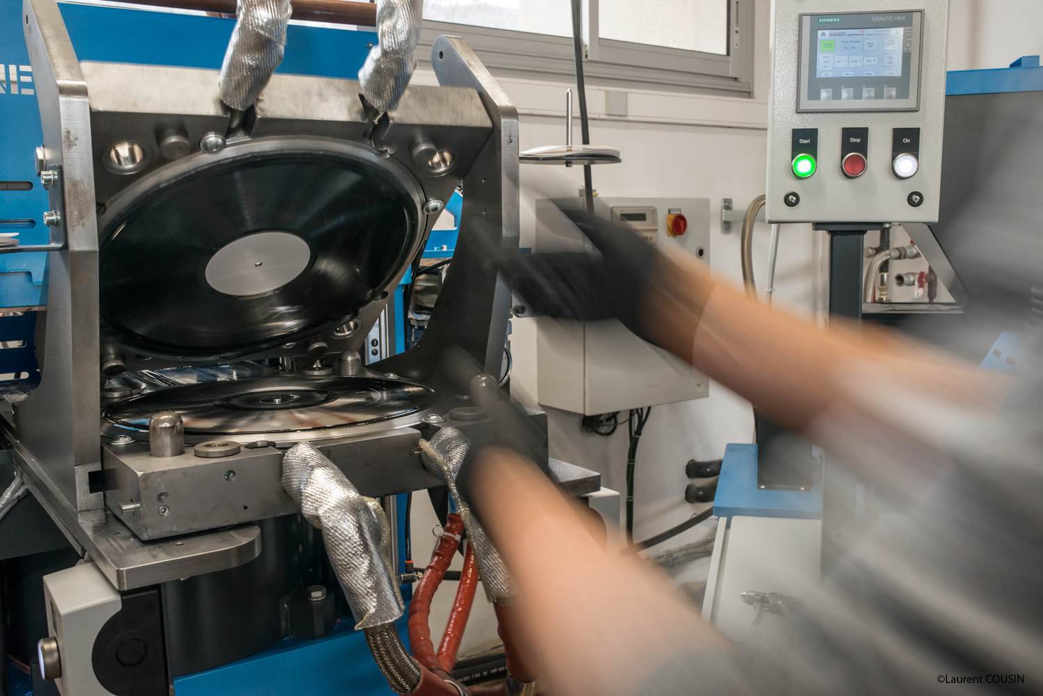 Fermeture de la presse ou le bloc de vinyle subit une pression de 150 tonnes a 180 °c pendant une trentaine de secondes.